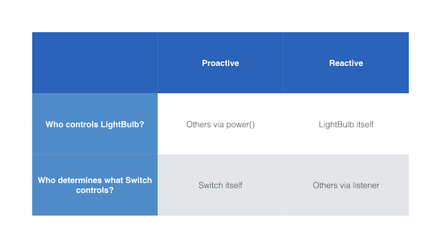 The second difference is who determines what the Switch controls. In the proactive model, the Switch itself determines who it controls. In the reactive model, the Switch is ignorant of what it's driving, since others hook into it via a listener.