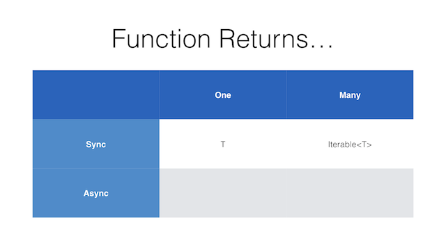 There are four essential objects that a function can return. On one axis is how many of an item is returned: either a single item, or multiple items. On the other axis is whether the item is returned immediately (sync) or if the item represents a value that will be delivered later (async).